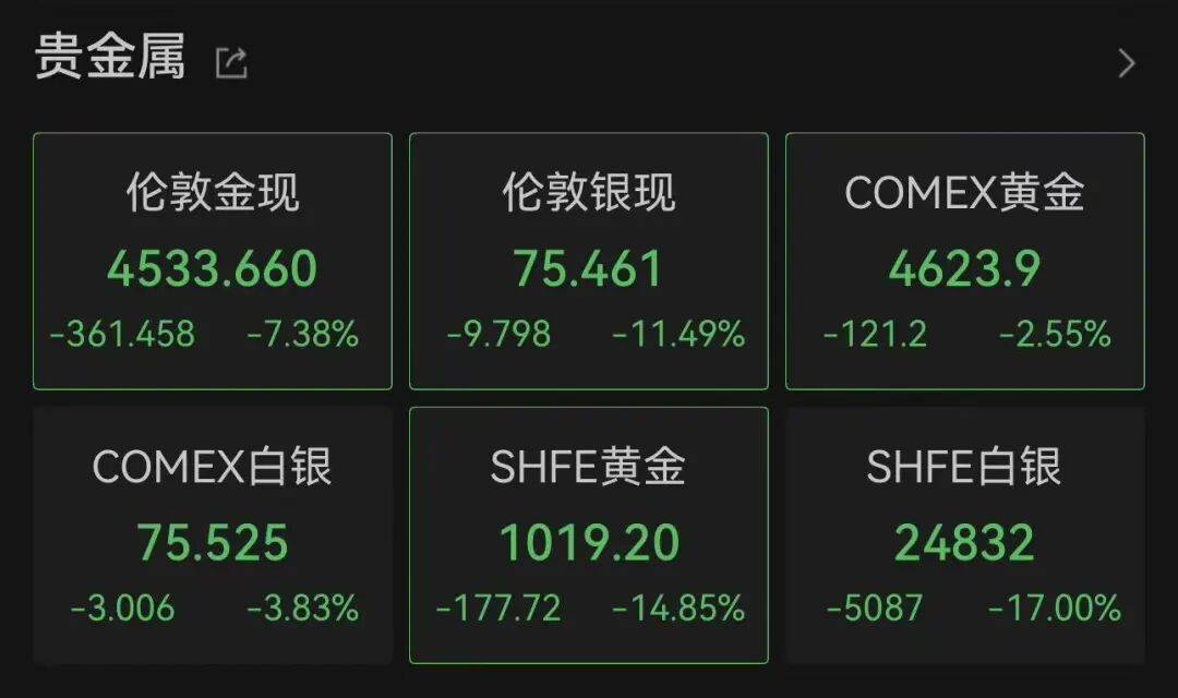 2月2日午后,现货黄金一度失守4500美元/盎司为1月9日以来首次,日内重挫7.9%;截至发稿,报4533.66美元/盎司,跌7.38%;