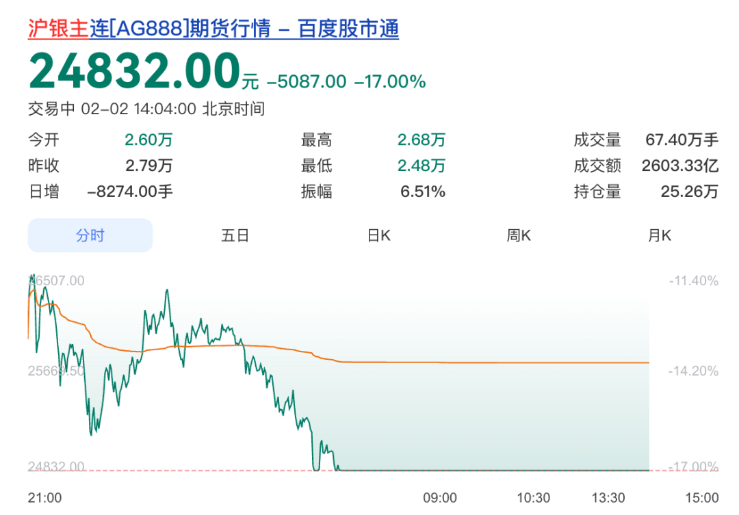 通知称,鉴于目前白银价格波动幅度较大,为防范市场风险,根据《上海黄金交易所风险控制管理办法》的有关规定,该所经研究决定,对白银延期合约交易保证金水平和涨跌停板比例进行调整。根据通知,若2026年2月2日(星期一)Ag(T+D)合约出现单边市情况,则自收盘清算时起,该合约的保证金水平从20%调整为26%,下一交易日起涨跌幅度限制从19%调整为25%。若未出现单边市情况,则Ag(T+D)合约保证金水平和涨跌幅度限制维持不变。